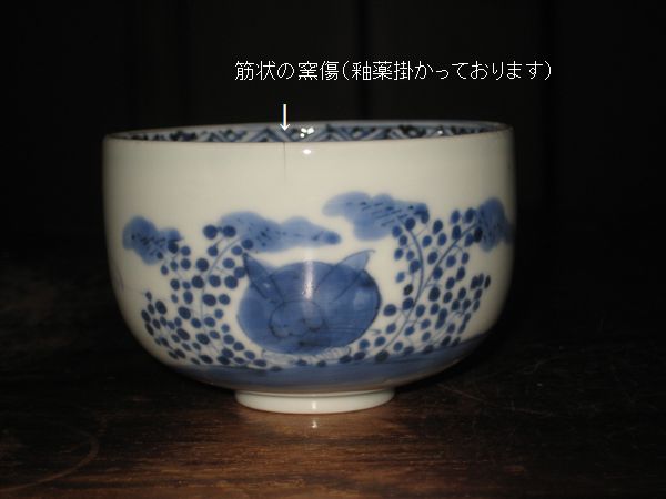 A-0028 詳細画像 その1 ご売約済みです その2 A-0028 兎文 ころ茶碗 江戸後期 状態 無傷 その2は,口縁から縦に,筋状の窯傷があります どちらも気持ち楕円で,がたつき少々あります。 価格1客 6,000円(その1) 価格1客 5,000円(その2) その1は,ご売約済みです お買い上げ頂き,ありがとうございました。