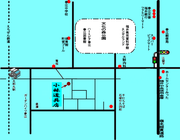 小林道具店 - Google マップ 北陸自動車道丸岡インターで降車 道なりに西へ約1キロ 左折して国道8号線に出られます 7〜800メートル先の高柳の交差点を右折 約3キロ先の三叉路の交差点を左折 嶺北縦貫道路(県道29号線)3個目の信号(江留下)を右折 (県道160号線)約1キロ先右側に小林道具店の看板がでています 看板のある三叉路 左に大きくカーブした道に入っていただき 道なりに(左カーブ)約100メートル進むと 右側に小林道具店の小さな看板があります 右折するとすぐに小林道具店があります |